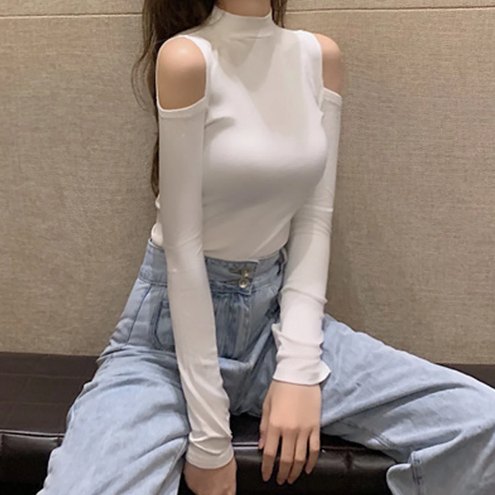 Women Autumn Solid Color Cold Shoulder Long Sleeve Blouse Mock Neck Slim T-shirt